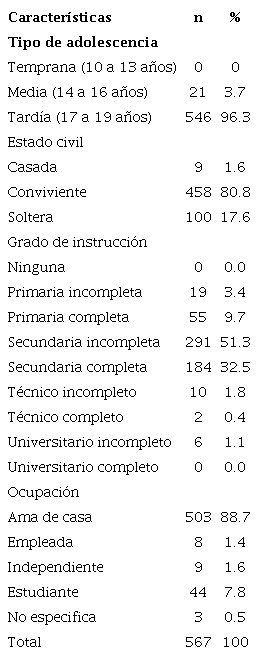 Del total de paciente multíparas, 546 (96.3%) se encontraron en el grupo de adolescencia tardía y el restante, 21 (3,7%), en el grupo de adolescencia media; la mayoría eran convivientes con 458 casos (80,8%) y solo 9 (1,6%), eran casadas. En cuanto al grado de instrucción la mayoría contaba con secundaria, sea completa o incompleta, con 475 casos (83,8%), seguida por multíparas con primaria completa (55 casos, 9.7%) (Tabla 1).