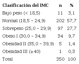 Respecto al IMC con el que iniciaron el embarazo, de las 567 pacientes, solo se obtuvo este dato en 350 (61.7%) de ellas. De las que tenían registrada esta información, el 27.7% (97) tenían sobrepeso y 11.4% tenían obesidad, predominando en estas la obesidad I con 9.7% (Tabla 2).