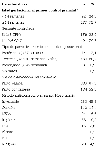 Sobre los datos del inicio de controles prenatales, solo en 379 pacientes se registró este dato. Tomando este grupo como un 100%, 287 (75,7%) iniciaron sus controles prenatales a las 14 semanas o más de embarazo y 92 (24,3%) iniciaron antes de las 14 semanas. Las participantes que tuvieron por lo menos 6 controles prenatales (por lo tanto, consideradas como controladas de acuerdo con el MINSA) fueron 159 (28%) y 401 (70,7%) fueron gestantes no controladas (Tabla 3).