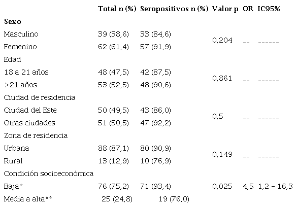 Participaron del estudio 101 participantes de 18 a 25 años en el periodo del 10 al 31 de enero del 2020. El mayor porcentaje de participantes fue del sexo femenino con 61,4% (n: 62), provenientes de Ciudad del Este en un 49,5% (n: 50), de una zona urbana con 87,1% (n: 88), con edad mayor a 21 años el 52,5% (n: 53), y de una condición socioeconómica baja el 75,2% (n: 76). La seroprevalencia global fue del 89,1% (IC 95%: 83% - 95,2%). El único factor con asociación estadísticamente significativa a la seropositividad fue la condición socioeconómica baja, con 4,5 más posibilidades de contraer la infección por el virus en esta condición (Tabla 1).