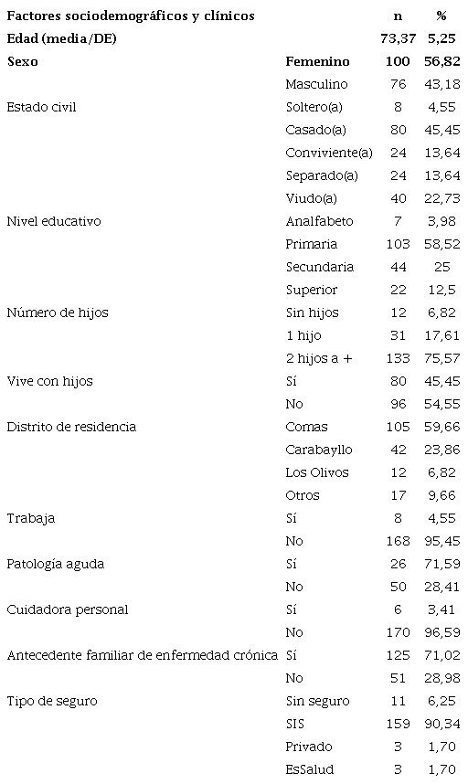 Se consideraron también características sociodemográficas y clínicas como edad, sexo, estado civil, nivel educativo, número de hijos, si viven o no con sus hijos, distrito de residencia, trabajo, patologías agudas, si cuentan o no con cuidadora personal, tipo de seguro y antecedentes familiares con enfermedades crónicas que fue medida con la siguiente pregunta: ¿sus padres o hermanos padecen de enfermedades crónicas o que no tienen cura?