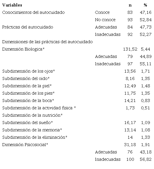 El 52,84% de los adultos mayores encuestados no conoce sobre el autocuidado y el 47,16% lo conoce. Por otro lado, el 52,27% tiene prácticas inadecuadas sobre el autocuidado para el envejecimiento con bienestar, mientras que el 47,73% lo práctica adecuadamente. Respecto a las dimensiones, más de la mitad de los participantes tiene prácticas inadecuadas del autocuidado biológico (55,11%) y psicosocial (56,82%). Esto se visualiza de la misma manera en todas las subdimensiones qué están en la tabla 3.