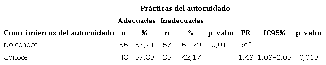 En la Tabla 4 se observa, a través de la prueba Chi-cuadrado, que existe una relación significativa entre las variables principales (p= 0,011). Asimismo, los adultos con un mayor conocimiento del autocuidado sobre el envejecimiento con bienestar presentan mejores prácticas (PRc: 1,49, IC 95%: 1,09-2,05 p valor=0,013).