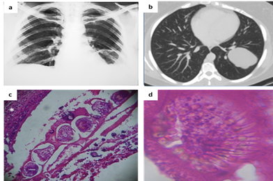 Caso 1. Mujer de 37 años, ama de casa, proveniente de zona urbana de la ciudad de Luque, sin comorbilidades, refiere disnea de larga data y consulta por cuadro de 3 días de tos, con expectoración purulenta, con estrías de sangre, dolor en región posteroinferior del hemitórax izquierdo y chillido de pecho. En el interrogatorio epidemiológico no refiere haber hecho viajes al exterior del país y refiere contacto cercano con dos canes que se alimentan de menudencias. Signos vitales estables. Nada remarcable al examen físico ni en analítica laboratorial básica. Test rápido para HIV: (-). Frotis (Gram y Ziehl-Neelsen) y cultivo de esputo: negativos. Radiografía (Rx) y Tomografía computarizada (TAC) tórax (Figura 1a y b). Ecografía abdominal: normal. Broncoscopía: árbol respiratorio normal. Se realiza lobectomía inferior izquierda. Histopatología denota parásito y estructuras características (Figura 1c y d). Diagnóstico: quiste hidatídico pulmonar autóctono. Recibió albendazol posterior a exéresis y al año de seguimiento se confirma cura.