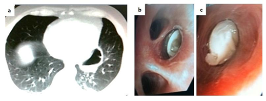 Caso 2. Varón de 50 años, ganadero, proveniente de Villa Oliva. Cuadro febril prolongado y tos. No refiere comorbilidades. Epidemiología: no hay suficientes datos sobre viajes al exterior. Examen físico: roncus difusos y hepatomegalia leve. TAC tórax: formación quística pulmón izquierdo (Figura 2a). Ecografía abdominal: hígado con múltiples quistes con contenido anecogénico. Fibrobroncoscopía: se observa material blanquecino emergiendo de bronquios segmentarios (Figura 2 b y c). Biopsia de material confirma membrana hidatídica. Diagnóstico: hidatidosis con compromiso multiorgánico (quiste pulmonar complicado y probable compromiso hepático). Se plantea tratamiento antiparasitario.