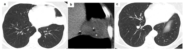 Caso 3. Mujer de 58 años, ama de casa, oriunda de zona urbana de Luque, sin antecedentes de migración, portadora de hipertensión arterial y diabetes mellitus, no fumadora que consulta por dolor en hemitorax izquierdo de larga data, ventilatorio dependiente más pérdida de peso y tos seca. Interrogatorio epidemiológico: no refiere haber viajado al exterior y tiene mascota (perro) que se alimenta de menudencias. TAC: opacidad redondeada en Figura 3a y 3b. Ecografía abdominal: normal. Broncoscopía: árbol bronquial sin peculiaridades. Antígeno hidatídico positivo por inmunocromatografía. Tratamiento: resección lobar y albendazol. Anatomía patológica: quiste hidatídico. Seguimiento al año sin secuelas clínicas aún con leve disminución del volumen pulmonar izquierdo posquirúrgico (Figura 3c).