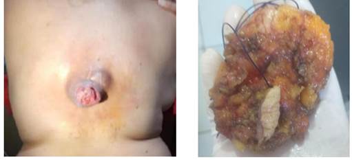 La mama derecha presenta edema de tejido celular subcutáneo con aspecto de piel de naranja sin tumoración palpable a causa de gran tumoración axilar homolateral. Y la mama izquierda es simétrica; no se observa retracción del pezón, no presenta secreción por pezón, no se ve ni se palpa tumoración