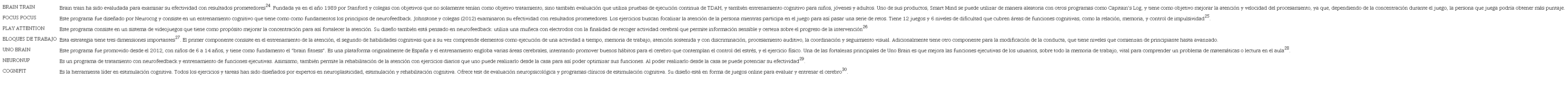 En otro metaanálisis, Van Doren y colegas (2019) examinaron también el neurofeedback y sus resultados sugieren que no se encontró efecto sobre la dificultad de atención, pero si un pequeño efecto en aspectos de hiperactividad y/o impulsividad. Las investigaciones tienen, entonces, resultados contradictorios; no obstante, el entrenamiento cognitivo basado en neurofeedback, y con apoyo de las tecnologías, incluyen muchas herramientas que pueden se resumen en la tabla 323.