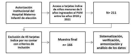 Recolección y procesamiento de datos: Las variables fueron recolectadas a través de una revisión documental de datos secundarios provenientes de las tarjetas índice de los ficheros de niños menores de 5 años ingresados al PANI entre los años 2018 y 2021, pertenecientes al Hospital de elección para el estudio, previa autorización de la Dirección General de dicha institución, realizada a través de una solicitud por escrito. Se obtuvo un total de 211 tarjetas índice correspondientes al PANI para el grupo de beneficiarios de niños menores de 5 años, de las cuales fueron descartadas 45 tarjetas índice que no cumplían con los criterios de inclusión, quedando finalmente una muestra de 166 tarjetas índice de niños menores de 5 años sin patologías de base. Posteriormente, se procedió a la fotocopia de las tarjetas índice que fueron seleccionadas según los criterios de inclusión (n=166), para luego realizar la carga digital en planilla Excel, para lo cual se construyó una matriz en base a las variables de interés registradas en las tarjetas índice. Diagrama 1