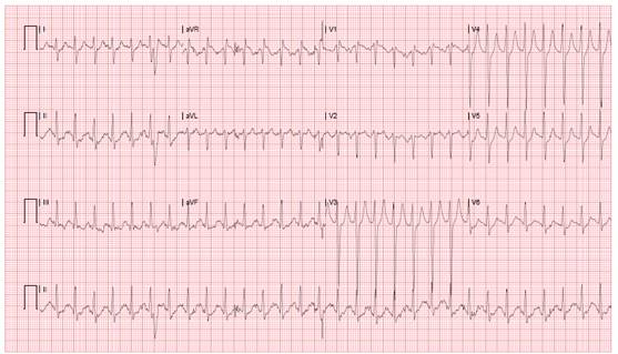 A la valoración primaria, sin protección de vía área por deterioro neurológico con Glasgow 7/15, pupilas midriáticas, hiporreactivas, hipotenso con PS 80 mmHg/PD 40 mmHg, en electrocardiograma se observa taquicardia supraventricular con FC 198 /min. (Figura 1).