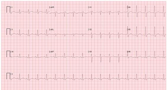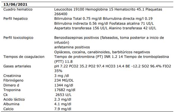 Se recibió reporte de laboratorios de ingreso (Tabla 1) con cuadro hemático con leucocitosis, gases arteriales con trastorno mixto acidosis metabólica con acidosis respiratoria, normoxemia, hiperlactatemia, albumina y calcio ( corregido) sin alteraciones, electrocardiograma control ritmo sinusal, con QT formula corregida de 432ms (Figura 2), con reporte de drogas en orina negativa para opiáceos, cocaína, cannabinoides, barbitúricos y positivos para benzodiacepinas (falseados, toma posterior a inicio de infusión) anfetamina positivos, biomarcadores troponina elevada secundario a taquiarritmia y cardioversiones múltiples versus lesión miocárdica aguda secundaria a toxicidad, CPK Total elevada sospecha de rabdomiólisis con etiología establecer cardioversión y/o efecto toxico; creatinina elevada, se optimiza aporte de líquidos a 3cc/ kg/h con lactato de ringer, con alta probabilidad de falla renal aguda, sin alteraciones de la coagulación al ingreso, se reporte radiografía de tórax y tomografía de cráneo simple normal sin alteraciones.