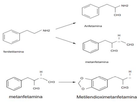 Las anfetaminas y sus derivados son aminas simpatomiméticas, de fórmula química estructural semejante a la adrenalina, la estructura química de las anfetaminas y sus derivados consiste en un anillo aromático (fen por fenilo) unido a una cadena de dos carbonos (etilo) que lleva un nitrógeno básico en el extremo distal de la cadena de carbono (amina) (Figura 3).