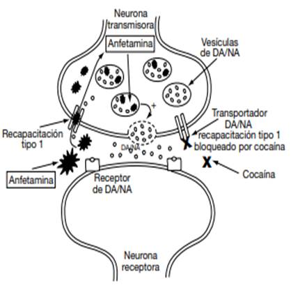 A su vez altera el transportador vesicular de monoaminas (VMAT2) que se localiza principalmente en el SNC y es el responsable del transporte de las monoaminas presentes en el citoplasma hacia las vesículas de almacenamiento. Igualmente, las anfetaminas pueden interrumpir el gradiente de protones existente en las membranas de estas vesículas sinápticas y así también su funcionamiento. De esta forma es que invierten el flujo de estos transportadores produciendo así un aumento de las concentraciones citoplasmáticas de noradrenalina, dopamina y serotonina. Puesto que el VMAT2 puede ejercer un papel relevante en la estimulación locomotriz y en las propiedades reforzantes producidas por las anfetaminas, lo que sería una diana para el desarrollo de estrategias terapéuticas para los procesos adictivos relacionados con el uso de psicoestimulantes5.