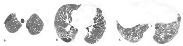 Varón de 71 años, fumador 45 cajas/año, comerciante con Diabetes mellitus tratado con hipoglicemiantes orales. Presenta disnea a grandes esfuerzos de un año de evolución que se hace a pequeños esfuerzos desde hace 3 meses. Escasa tos seca y chillido de pecho ocasional. Frecuencia cardiaca 86 x min; SatO2 90%. Acropaquia. Se auscultan crepitantes en ambas bases hasta campo medio. La TACAR de tórax muestra calcificación coronaria extensa de la rama descendente anterior (no mostrada en la figura 2) con llamativo compromiso del parénquima pulmonar. Espirometría: CVF 66% del valor previsto, VEF1 67% del previsto y VEF1/CVF 79; Prueba de difusión de monóxido de carbono ajustada a hemoglobina (DLCOaj) 19% del previsto. Ecocardiograma: disfunción diastólica leve del ventrículo izquierdo, dilatación auricular bilateral, sin signos directos ni indirectos de hipertensión pulmonar. Se sospecha neumonía intersticial descamativa (DIP: desquamative interstitial pneumonia) y como medidas de tratamiento se sugieren: cese de tabaquismo, oxigenoterapia, broncodilatadores, rehabilitación pulmonar y tratamiento con prednisona. Meses después, ante la falta de respuesta terapéutica se agrega micofenolato.
