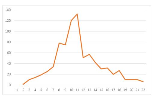 En el estudio participaron 803 adultos con una edad promedio de 45.13 ± 18.63 años. De estos, el 64,13% (515) eran mujeres. Si bien la mayoría de los participantes, el 97,88% (786), residía en el departamento de Caaguazú, algunos pacientes provenían de otros departamentos (7 del departamento de San Pedro, 6 del departamento Central, 3 del departamento de Guairá, y 1 del departamento de Canindeyú. La distribución de los casos a lo largo de las semanas epidemiológicas fue como sigue: en la semana 8 se registraron 78 casos, en la semana 10, 120 casos, y en la semana 11, 132 casos, tal como se muestra en la Figura 1.