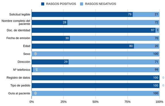 “Por lo general la solicitud de análisis es por casillero (impreso), es decir, no se escribe, solo se marca, si tenemos casos de que no concuerda el número de cédula con el paciente, nuestro sistema reconoce número de cédula, al ingresar aparece la identidad del paciente y cotejamos, si coincide con el nombre que figura en la orden se puede procesar la muestra” (OO). “Es de prioridad solicitar al paciente el documento de identidad, si no trae consigo, se registra su número de cédula y nombre completo” (X).