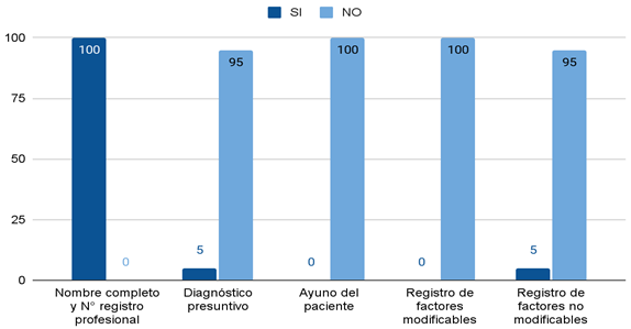 De la solicitud médica el personal de laboratorio recibe la información necesaria para realizar su trabajo. Todos los datos que puedan incluirse en la fase pre-analítica son importantes, pero algunos de ellos son imprescindibles, a tal punto que si la muestra, la solicitud o el propio paciente no cumplen las condiciones adecuadas, no se recomienda iniciar el procedimiento analítico. Se halló que entre un 95-100% de los médicos o técnicos de laboratorio no aportan datos que ayudarían a una mejor interpretación de la clínica del paciente tales como: el diagnóstico presuntivo, el registro de factores modificables / no modificables y las horas de ayuno previas al momento de la toma de muestra. Figura 2