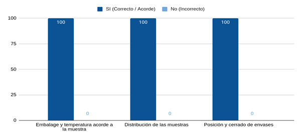En lo que se refiere a transporte y distribución se ha observado que los embalajes y temperaturas fueron acordes, las muestras fueron distribuidas en los sitios correspondientes y de forma adecuada. Figura 4