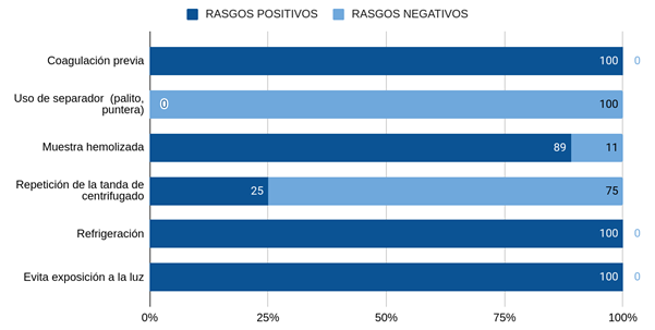 Las bibliografías consultadas para este trabajo de investigación mencionan que no es adecuado trabajar con muestras hemolizadas, caso que se presentó en un 11%4-6. También fue visto el uso de separadores de muestra (palito, puntera) y una tanda repetida de centrifugación en un 100%; lo cual no se aconseja en ciertas determinaciones por posible hemólisis o contaminación. En lo que se refiere a conservación, al 100% tuvieron cuidado de mantener las muestras y/o reactivos bien refrigeradas y fuera de cualquier ambiente expuesto a cantidades considerables de luz (solar/eléctrica). Figura 5