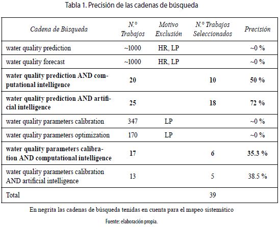 La cadena con la cual se obtuvieron los mejores resultados en cuanto a precisión fue ''water quality prediction AND artificial intelligence'' con un 72 % en la precisión. Finalmente, en esta etapa fueron seleccionados 39 trabajos relevantes para el presente estudio.