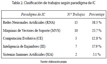D. Clasificación de artículos. El proceso de clasificación de trabajos está basado en la agrupación planteada por Engelbrecht [7] en la cual se establecen varios paradigmas de IC y en cada uno de ellos se han distribuido los trabajos seleccionados en el paso C de acuerdo con su relación con un paradigma determinado (ver tabla 2).