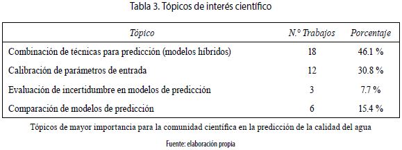 Teniendo en cuenta la pregunta de investigación RQ.1 referente a los temas de interés para la comunidad científica dentro de una ventana de tiempo reciente (últimos 10 años), la predicción de la calidad del agua representa un amplio campo de investigación en el cual los autores enfocan sus trabajos alrededor de diferentes subtemas específicos. Por consiguiente, se ha establecido una clasificación con los tópicos hacia los cuales se orientan con mayor frecuencia los trabajos seleccionados y, además, los temas de investigación planteados como trabajo a futuro. En la tabla 3 se presenta la clasificación mencionada.