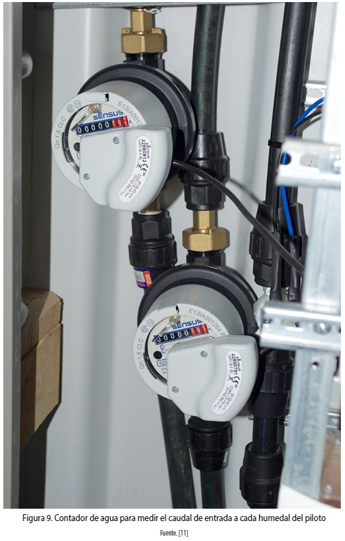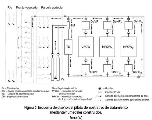El afluente del humedal se bombea a partir de dos piezómetros construidos en la parcela agrícola, que captan el agua subsuperficial en la zona. El tratamiento primario se realiza en un tanque de sedimentación de donde puede conducirse a cualquiera de los humedales (HFCWs o VFCW), ya que cada uno tiene su propio depósito de bombeo y de recogida. Los elementos de la domótica instalada permiten tener un sistema flexible, donde se puede decidir cuál es el ciclo que se debe hacer de acuerdo con las características del agua: tratar el afluente por el VFCW y posteriormente por los HFCW, o viceversa, así como recircularlo, según se muestra en la figura 6. Adicionalmente, el sistema permite la operación del prototipo de forma automática y permite crear y modificar las reglas de funcionamiento de cada componente electrónico del sistema (bombas de flujo, caudalímetros, electroválvulas, sensores de temperatura y de nivel, etc.).