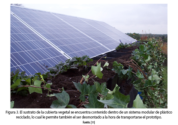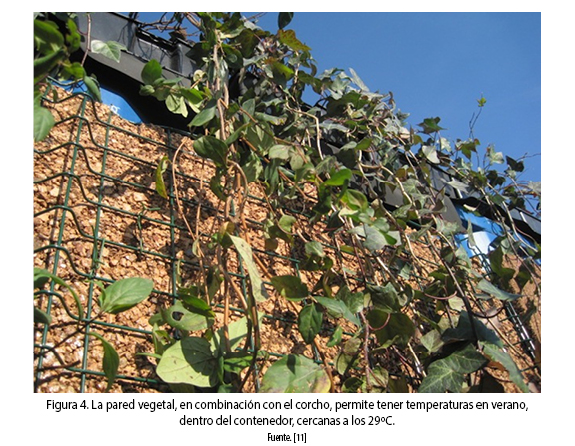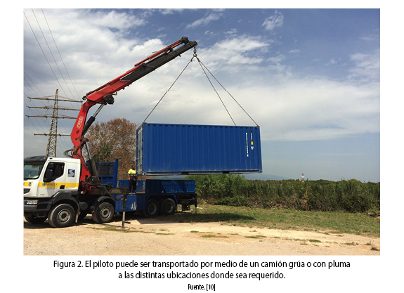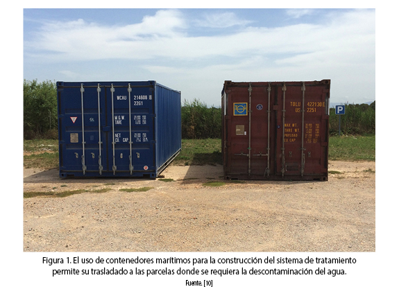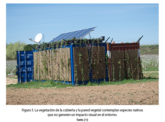 El piloto demostrativo se ha realizado con un innovador proceso constructivo basado en el uso de contenedores marítimos, como se puede ver en las figuras 1 y 2. Se trata de un prototipo compacto, modular y móvil que no causa impacto en el terreno: compacto, por la recirculación del efluente entre los distintos humedales construidos, alcanza remociones de contaminantes más altas en un área menor; modular, por incrementar la superficie de tratamiento, y agrega más contenedores y modifica algunos elementos destinados a su operación (bombas, electroválvulas, etc.), y móvil, porque puede ser trasportado a otra ubicación. El prototipo se ha cubierto mediante una cubierta (figura 3) y una pared vegetal con placas de corcho como base (figura 4), para protegerlo de los efectos de temperaturas extremas, las cuáles podrían afectar el funcionamiento de los componentes electrónicos. La vegetación, además de mantener el confort térmico dentro de los contenedores marítimos, le permite al prototipo adaptarse al paisaje agrícola de la zona (figura 5).