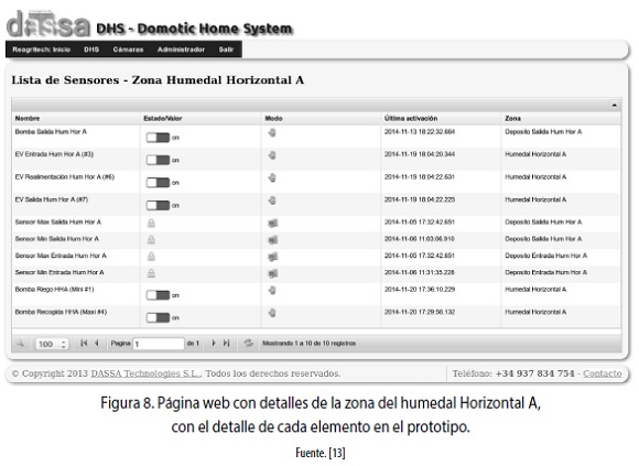 Un sistema base web permite la monitorización a distancia y ajustar los parámetros de operación según las necesidades del proyecto (cantidad y características del afluente y efluente, condiciones climatológicas, etc.). La plataforma web, presentada en la figura 7, divide el sistema por zonas, diferenciando cada uno de los elementos que lo componen: elementos de entrada del efluente, humedal vertical, humedal horizontal A y B, zonas comunes.