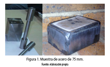 La figura 1 muestra el material en estudio con espesor de 75 mm cortado bajo condiciones de temperatura controladas en el proceso de corte por láser. Igualmente, se elaboran probetas para ensayo a tensión bajo las normas técnicas ASTM E8-13: ''Standard Test Method for Tension Testing of Metallic Materials'' [12] y ASTM A370-11: ''Standard Test Methods and Definitions for Mechanical Testing of Steel Products'' [13] y las pruebas fueron llevadas a cabo en una máquina de ensayos universal INSTRON 5586. Adicionalmente, a la muestra se le hace un análisis de composición química atendiendo los parámetros de la norma técnica ASTM A751-08: Standard Test Methods, Practices, and Terminology for Chemical Analysis of Steel Products [14] y empleando el espectrómetro de emisión óptica por chispa THERMOSCIENTIFIC.
