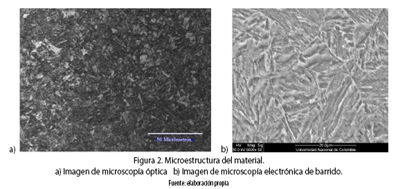 La Tabla presenta, en resumen, los resultados de la composición química, y en la Figura 2 se evidencia la microestructura martensítica de grano fino, tamaño 8, que posee el material, obtenida en microscopía óptica y electrónica, respectivamente.