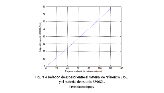 Tal como lo plantean Gajjar et al. [8], se igualan las ecuaciones del material de referencia S355J contra las características del material de estudio, acero S690QL. Asumiendo que el ancho de la placa a procesar es igual para ambos casos, los autores [8] proponen una ecuación (2) donde se calcula el espesor en función de