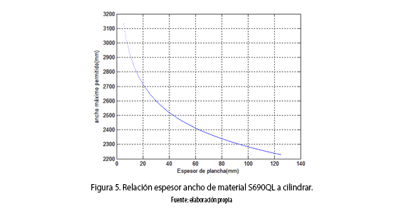 Por otro lado, y también como resultado del algoritmo, se puede determinar cuál debería ser el ancho máximo de acero que se permite curvar dependiendo del espesor demandado, y se presenta por medio de la Figura 5.