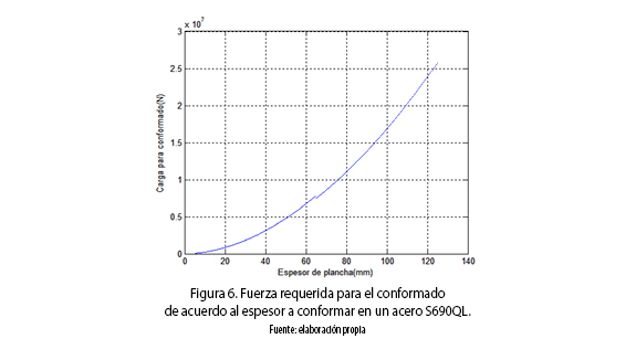 Para completar las principales relaciones a considerar en el conformado de un acero de alta resistencia mecánica de acuerdo con las características aquí descritas se puede tener la gráfica de relación espesor y carga requerida para conformado en frío (Figura 6), de tal forma que no sea excesiva y se produzca una re-laminación pero que tampoco sea tan débil como para no obtener el radio necesario.