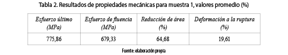 Fuente: elaboración propiaLa Tabla resume las propiedades mecánicas obtenidas por el ensayo a tracción con las muestras del material.