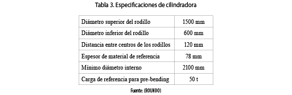Ya que la capacidad de carga, rango de espesores y largo máximo que por diseño podrá procesar una máquina roladora de 3 rodillos asimétricos serán de importancia para determinar los máximos y mínimos de acuerdo al material de estudio, se emplearán las características de máquina que se presentan en la tabla 3.