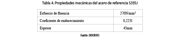 Asimismo, y teniendo en cuenta los parámetros iniciales especificados para una cilindradora de 3 rodillos con las características mencionadas, se toma como material de referencia el acero S355J, según norma inglesa en un espesor de 45 mm con las propiedades mecánicas listadas en la Tabla, de tal forma que se tenga el material estandarizado por el fabricante de la máquina para extrapolar los resultados con las propiedades del material a trabajar.