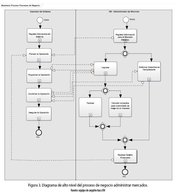 La figura 3 muestra el diagrama en BPMN de la administración del mercado, resultado de seguir el proceso descrito anteriormente. Este diagrama es un diagrama de alto nivel en el que se pueden observar los stakeholder, los subprocesos de la operación, los subprocesos de la administración del mercado y los flujos de información representados por mensajes que viajan entre los participantes. En este nivel de detalle no se muestra la información que fluye dentro de los procesos de administración en XM; sin embargo, al ingresar a cada uno de los subprocesos se tiene mayor detalle y se puede observar el flujo de información entre los subprocesos y las actividades. Dentro de este modelado de proceso se hace un énfasis fuerte en el modelado de las reglas de negocio, ya que la mayoría de regulaciones que rigen la compañía se convierten en reglas de negocio.