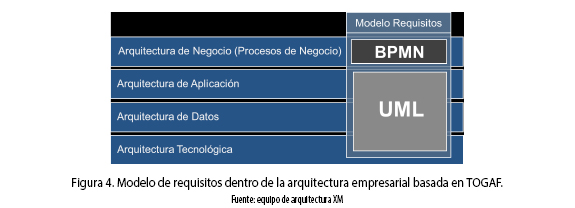 La figura 4 muestra cómo el modelo de requisitos permite comunicar necesidades y documentar algunos elementos de las dimensiones de una arquitectura empresarial según lo define TOGAF (The Open Group Architecture Framework) [21].