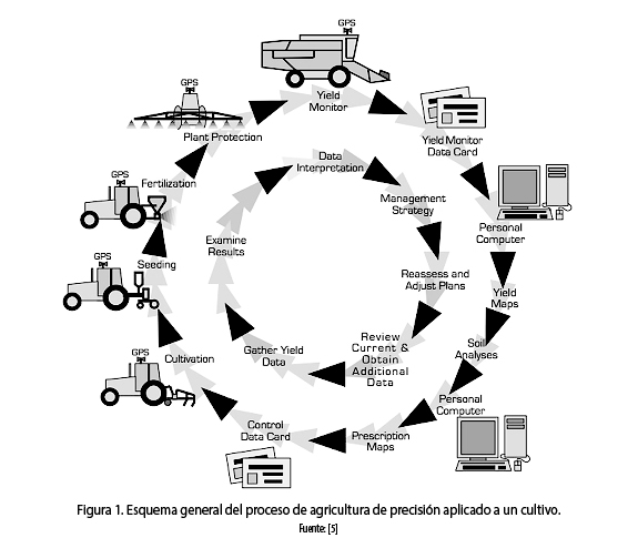 Los elementos descritos anteriormente conforman el dominio para la aplicación de AP en un cultivo. La transferencia, almacenamiento y procesamiento de datos facilitan la toma de decisiones de tipo económico, ambiental y logístico. La figura 1 [5] muestra un esquema general del proceso de AP en donde pueden utilizarse, además de GPS, los demás elementos descritos previamente. De la figura se observa que el esquema es cíclico, por lo que los procesos y las decisiones tomadas en etapas previas se tienen en cuenta para etapas futuras.