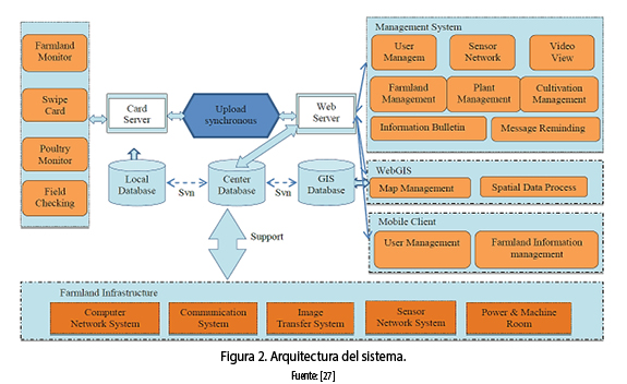 Los trabajos encontrados que pueden clasificarse en esta sección son relativamente pocos, empezando por Ye et al. [27], quienes presentan resultados de investigación acerca de la aplicación del Internet de las Cosas (IoT: Internet of Things) y los SIG basados en web (WebGIS) en la agricultura. Proponen un modelo de gestión de AP basado en cuatro plataformas: plataforma de infraestructura de información espacial, plataforma de IoT, plataforma de gestión de agricultura y cliente móvil. El sistema fue aplicado a una granja ecológica, ayudando al personal a reducir el tiempo de monitorización de los cultivos al presentar información en tiempo real, mejorando así la rentabilidad de los mismos. La figura 2 muestra la arquitectura en detalle.