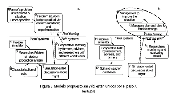 Por otra parte, en [28], los autores analizan la evolución de diferentes elementos relacionados con cultivos, suelos, clima, personas, metas, objetivos y toma de decisiones, de donde se centran en seis tipos de análisis de sistemas agrícolas. Los resultados obtenidos son evaluados en dos escenarios diferentes con cultivos diferentes. La aproximación a un modelo de gestión, monitorización, simulación y comunicación se muestra en la figura 3, en donde se observa un conjunto de procesos divididos en dos partes para facilitar la toma de decisiones, gestión y monitorización.