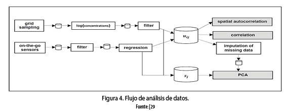 En [29] se describe un análisis de datos para experimentos en AP, incluyendo aplicaciones para el caso de uso de la caña de azúcar. Este análisis se basa en la representación de técnicas de adquisición de datos, la estimación de ruido en cada medición, el análisis de autocorrelación espacial para cada atributo y el análisis de componentes principales (PCA: Principal Component Analysis) de los mismos. Los resultados obtenidos son datos de la diversidad del suelo y atributos del cultivo, medidos por técnicas de AP, obteniéndose una alta correlación en diversas variables. El sistema para dicho análisis se muestra en la figura 4, de donde se observa el tratamiento de información de manera correlacional y el análisis de PCA realizado.