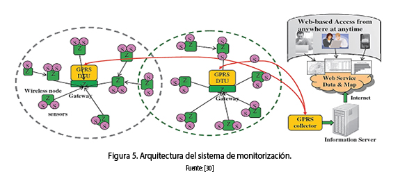 Finalmente, Wang et al. [30] proponen un sistema de monitorización de información basado en arquitectura abierta, el cual consiste de redes de sensores junto con una plataforma de información del servicio. Los sensores capturan y reportan información entre ellos a través de técnicas multisalto y la transmiten mediante pasarelas GPRS hacia la plataforma de información, la cual genera reportes para informar a los encargados del cultivo. Además, los autores recalcan dos características que los sistemas de información deberían tener para optimizar sus aplicaciones: interfaces estándar y plataforma de servicio de información abierta. La figura 5 muestra la arquitectura del sistema propuesto por los autores.