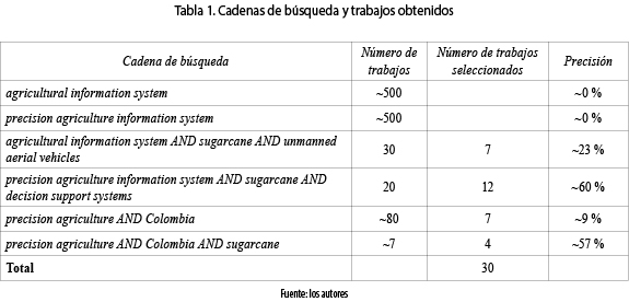 De los resultados en la tabla 1 se tiene que la cadena con la cual se obtuvieron los mejores resultados fue ''precision agriculture information system AND sugarcane AND decision support systems'', con un 60 % de precisión. En esta etapa fueron seleccionados 30 trabajos relevantes para el presente estudio.