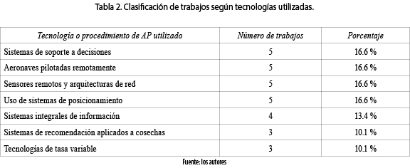El proceso de clasificación de trabajos está basado en las tecnologías y procedimientos de AP que utilizan los autores de los artículos seleccionados en la sección anterior. La tabla 2 muestra los trabajos enfocados en los procesos de AP descritos en la sección 1, junto con su peso porcentual.