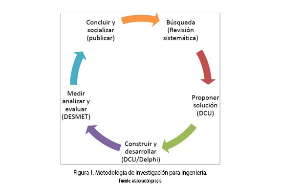 En la figura 1, se observa la metodología de investigación que se siguió en el desarrollo de este trabajo [16]. Se inicia con una base conceptual a partir de una revisión sistemática de temas relacionados; luego se seleccionaron las tecnologías para sensar los datos del contexto, y tecnologías para los desarrollos software, usando la metodología Delphi [17]. Para el diseño, desarrollo y evaluación del prototipo del sistema se adoptaron algunos principios de la metodología de diseño centrado en el usuario (DCU) [16], y se realizaron pruebas de usabilidad con un grupo de usuarios que evaluaron el prototipo presentado en este artículo.