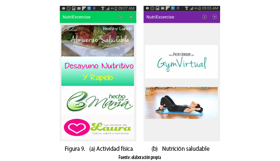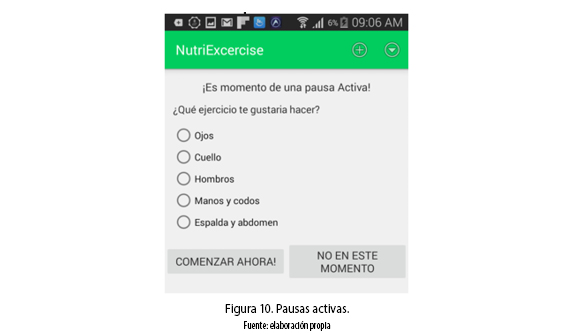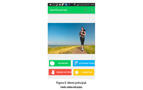 Menú principal y recomendaciones: cuando el usuario llega al menú después de iniciar sesión, puede escoger una opción del menú principal (figura 8): actividad física, nutrición saludable, pausas activas y favorito, y en el caso de las 3 primeras se obtendrán recomendaciones (figura 9 a y b) basadas en el resultado del algoritmo en el servidor, agente inteligente. Es importante resaltar que el contexto es sensado en todas las interfaces de la aplicación después de realizado el inicio de sesión, para que las intervenciones cambien a medida que el contexto cambie.