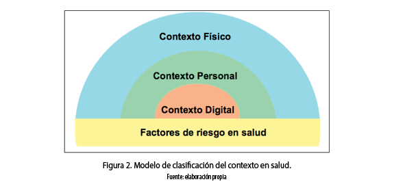 La figura 2 representa la definición del contexto propuesta en este trabajo, la cual es una clasificación de 4 capas para contexto en salud que experimenta un usuario. Este modelo nace a partir de la definición del contexto mencionada en [8], donde se hace referencia puntual a los lugares donde se encuentra el usuario, las actividades que realiza y las personas y objetos que lo rodean [7, 9, 21]. Estos elementos se tomaron como referencia para generar un modelo en cebolla, donde se agrupan los diferentes contextos que influyen en la salud de las personas: contexto digital (dispositivos que tiene el usuario), contexto personal (¿quién es? y ¿por qué usa el sistema?), contexto físico (¿qué hace?, ¿dónde está?) y factores de riesgo en salud que son cualquier rasgo, característica o exposición de un individuo que aumente su probabilidad de sufrir una enfermedad o lesión [22].