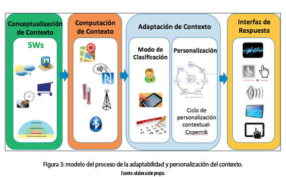 Tercera etapa, adaptación de contexto. Esta se organizó en dos partes: la primera incluye el modo de clasificación: aquí se hace referencia a un proceso manual de adaptación, es decir, que el sistema antes de realizar una acción pregunta lo que el usuario desea. La segunda parte corresponde a la personalización: esta etapa se refiere al proceso automático en que el sistema aprende y realiza acciones en el momento apropiado cuando el usuario quiera que ocurran, para esto se usa el marco de referencia llamado Ciclo de personalización contextual Copernik [23].